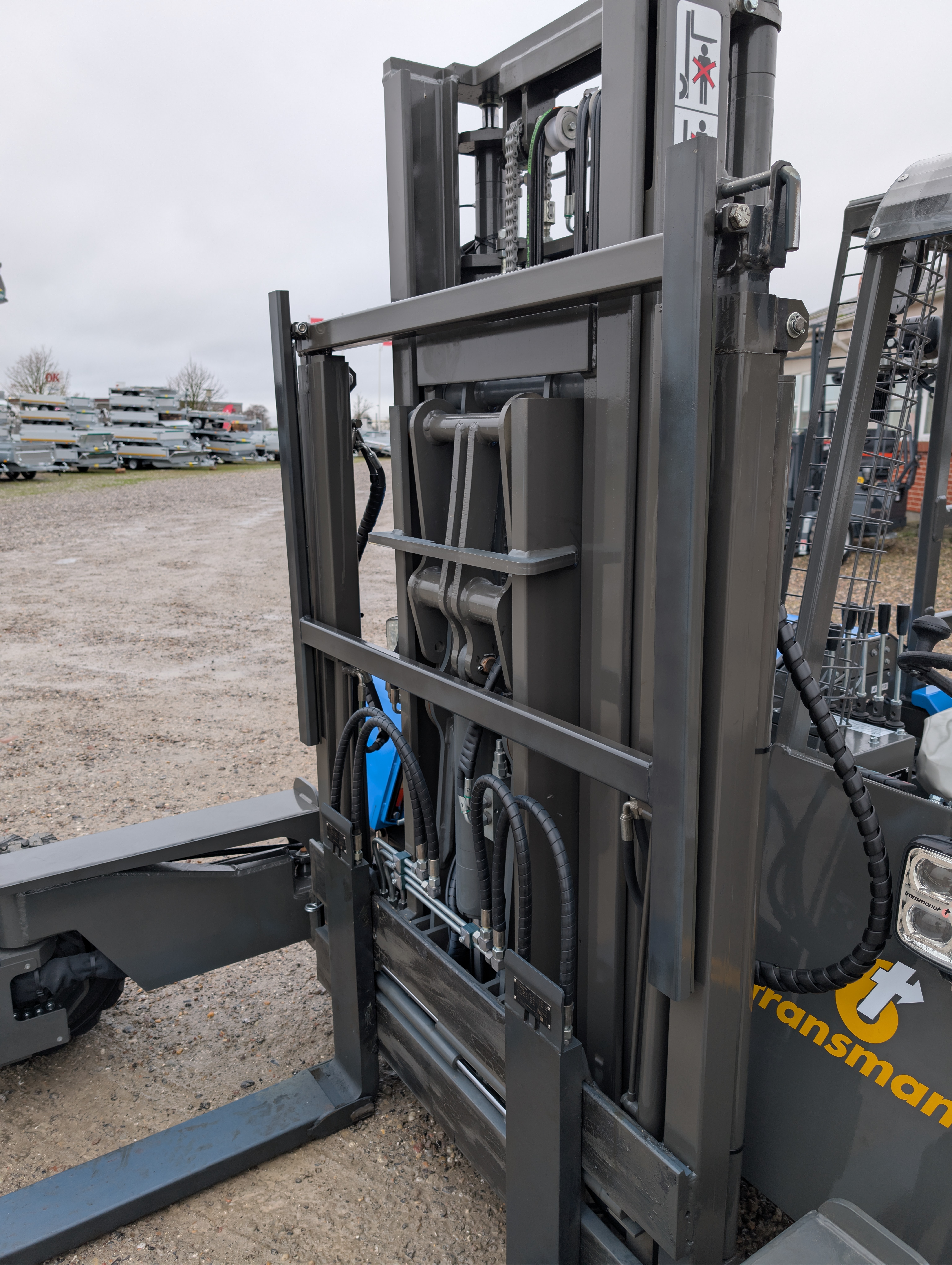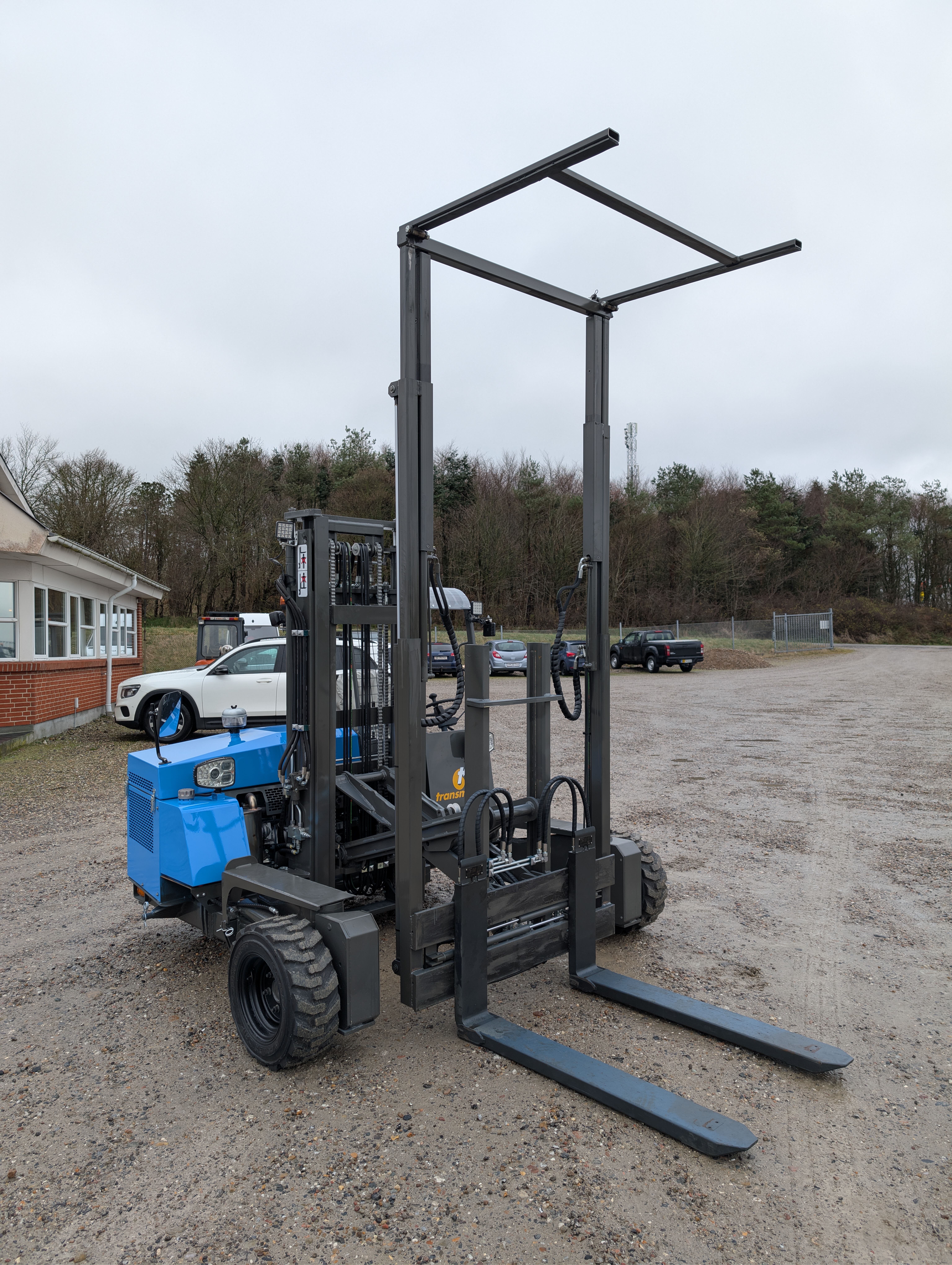 Vi har monteret vores største vinduesklemme, som vi hos Nordmas har udviklet for mange år siden. Denne model har en imponerende klemmehøjde på over tre meter, hvilket gør det muligt at håndtere selv de største vinduer. Klemmen foldes manuelt op, hvorefter hydraulikken tager over og styres fra kabinen via truckens eksisterende håndtag.