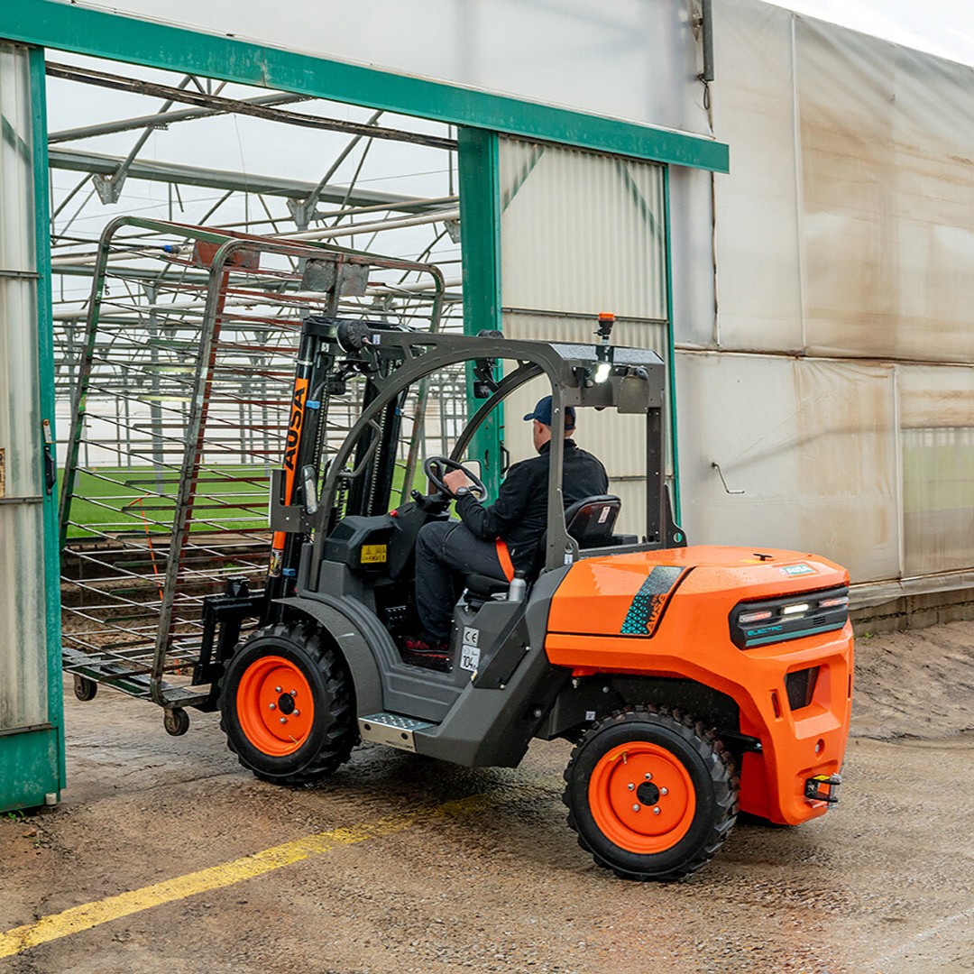 - Terrængående elektrisk gaffeltruck med høj stabilitet på ujævnt underlag
