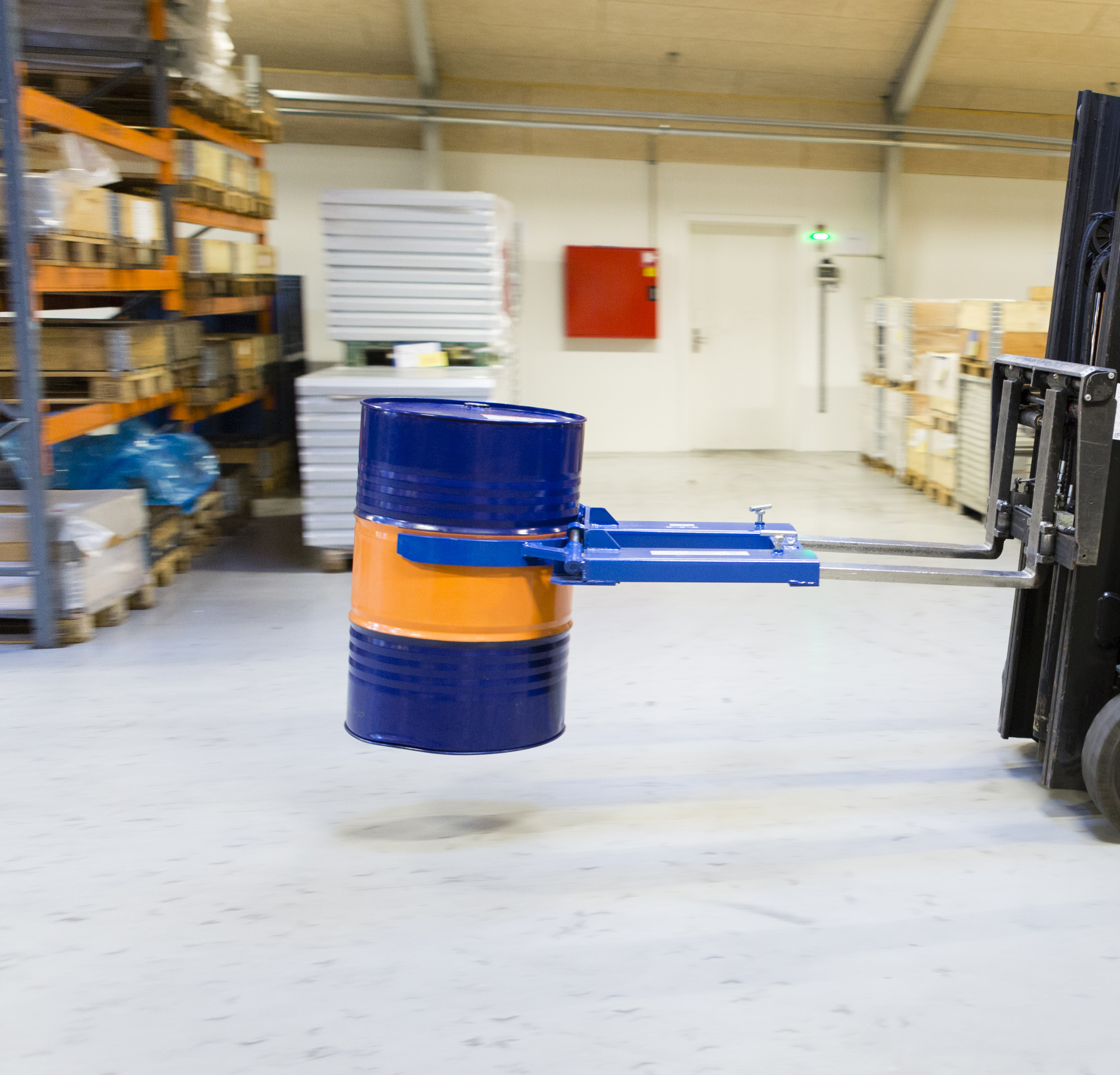 Trommegriberen er designet til gaffeltrucks og gør det nemt og hurtigt at løfte 210 liters ståltromler uden behov for hydraulik eller elektriske forbindelser. Den glider nemt på gaflerne og sikres med skruer. Med denne løsning kan du løfte, transportere og placere tromlerne, alt sammen fra førerpositionen uden af stige ud af trucken. Løfter både stål og plastik tønder.